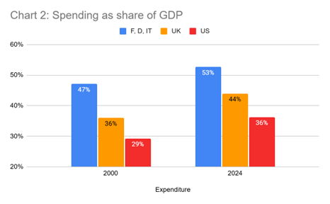 The United States has also seen an increase too. This is not a problem unique to Europe. But America started from a much lower base and has remained, by comparative standards, a relatively low-tax, low-spend economy. That difference matters.