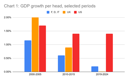 That is especially true in economies already at the frontier. If you are France or Germany or Britain, to get growth you need entrepreneurship, innovation, productivity improvement, and experimentation of all kinds. You need, in short, a system that rewards successful effort and allows failures to be rapidly liquidated. Instead we have systems that entrench incumbents, protect insiders and make every decision more political. And that is showing up in the growth figures.