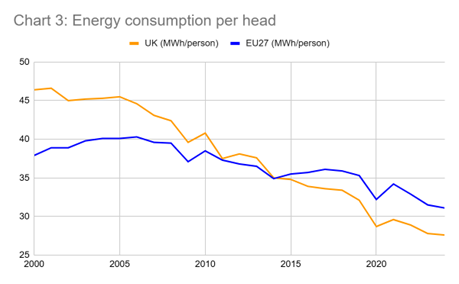 Since the mid-2000s - really since the beginning of the climate panic - energy consumption per head has fallen across Europe. In the EU27 it is down by roughly 20%. In the UK it is down by 40%.