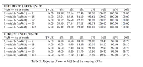 This method is powerful because a false model will generate behaviour different from the true model that is found in the actual data; the ‘match’ of the two will only be good if it is the true model that is being simulated. Only then will the features coincide. The closeness of the match is measured by the p-value: this measures the probability that this data behaviour came from this model. As any falseness in the model will change its behaviour, the matching test picks it up sensitively. We use a p-value of 5% as the threshold at which we reject the model as having too poor a match; this corresponds to the usual 95% confidence level for the test; an equivalent metric converts this into a t-statistic, whose 95% value is 1.645; values above this correspond to rejection. In our work we have checked out the properties of both the likelihood-based direct inference method and the indirect inference tests by Monte Carlo means, whereby we create an artificial laboratory in which we postulate a true model, create artificial data from it, and see how the two tests fare in their power to reject false models. We show the comparative results below in Table 1 for a structural (i.e. causal) macro model of the economy. What this Table shows is that when the data behaviour is described by different Vector Auto Regressions (VARs)3, with different numbers of variables and lags, and hence of VAR coefficients, then the rejection rate rises as the model parameters become more false, but it rises much more sharply under indirect inference than it does under direct inference. In fact, under indirect inference it rises progressively more sharply as the number of VAR coefficients rises, which implies we should limit this number, or we risk rejecting too many good models that get close to the data – e.g. being less than 5% false- typically we use 9, as in a 3 variable VAR (1) (i.e. with one lag). This is a problem that is good to have, as it allows us to choose strong power but not excessive power. This is not a problem with direct inference, as the power up to 5% falsity remains weak universally, with the rejection rate never rising much above 10%.