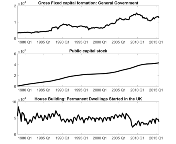 Thus, we extend our model to include these other factors that have been argued to contribute to growth- including public spending on infrastructure and especially housing provision, both of which have been hindered in the UK by government policies that have given power to special interest groups opposing development on environmental grounds.