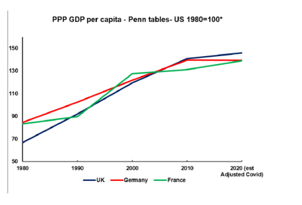 The UK effects of whatever was the magic ingredient in the 1980s are clearly visible in our lived experience since the Thatcher reforms of the 1980s, largely retained during the 1990s but since then progressively reversed by ill-considered, mostly EU-led, regulation combined with rising marginal tax rates. On GDP per capita, the UK had overtaken France and Germany in the 2000s as those reforms took effect, only to fall back relatively since then- see the following chart, based on the most widely used measure of GDP per capita at PPP calculated in the PENN world tables of national economies. This experience suggests that UK policy changes in this period, which were not happening elsewhere, were responsible, much as our growth theory implies. In the rest of this paper, we test that theory formally with econometric methods.