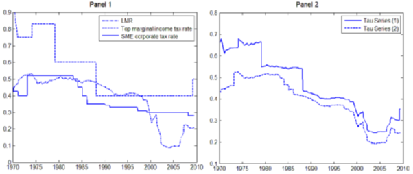 To estimate the data on the entrepreneurship disincentives from tax and regulation we use an index of labour market regulation (LMR), averaging indices of centralised collective bargaining (CCB) from the World Economic Forum and of the mandated cost of worker dismissal (MCD) from the World Bank, both reported by the Fraser Institute. For the other determinant, tax, the SME corporation tax rate (CTR) was used. The two, LME and CTR were averaged to create the overall disincentive variable (Tau 2) in the chart; it was interpolated to quarterly frequency using trade union membership. An alternative measure (Tau 1), which used the top marginal income tax rate instead of the corporation tax rate, gave similar results.