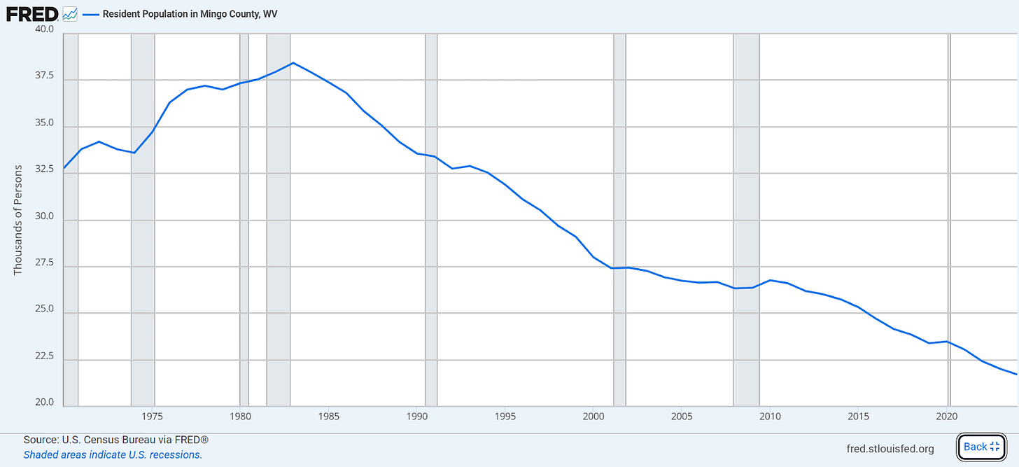 You wouldn’t recognise any of that today. Mingo’s population has dropped by around 50% since 1950. As coal mining jobs were eroded by automation, globalisation, and decarbonisation, people simply left.