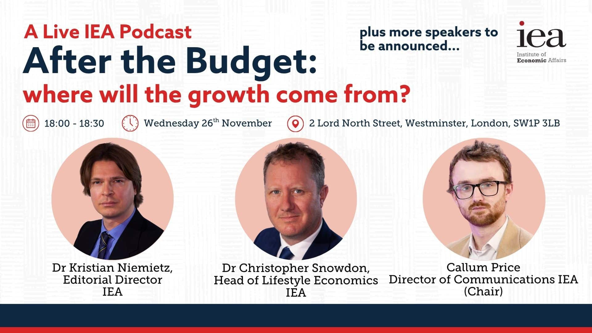 Following the Chancellor’s much anticipated Autumn budget we will be pouring over the details and giving our verdict at an exclusive live recording of the IEA podcast. We will debate the measures announced on the day, have a chance to judge the Chancellor’s actions against her own aims to prioritise economic growth, and discuss what should happen next to return economic dynamism to Britain.