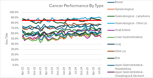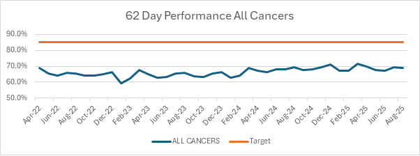 Since July 2024 there has not been an improvement in the proportion of cancer patients treated within 62 days. Currently only 69% of patients are treated within 62 days against a target of 85%. This national standard was last met in 2015.