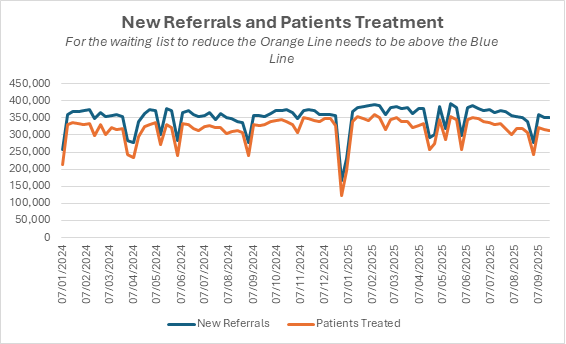 Over this period, the number of referrals per week has increased by a greater number than the number of patients treated. However, so far in 2025-26, the waiting list has decreased by 11,000 complete pathways rather than increasing by 537,000, which is the anticipated level based on the number of new referrals minus the number of completed pathways.